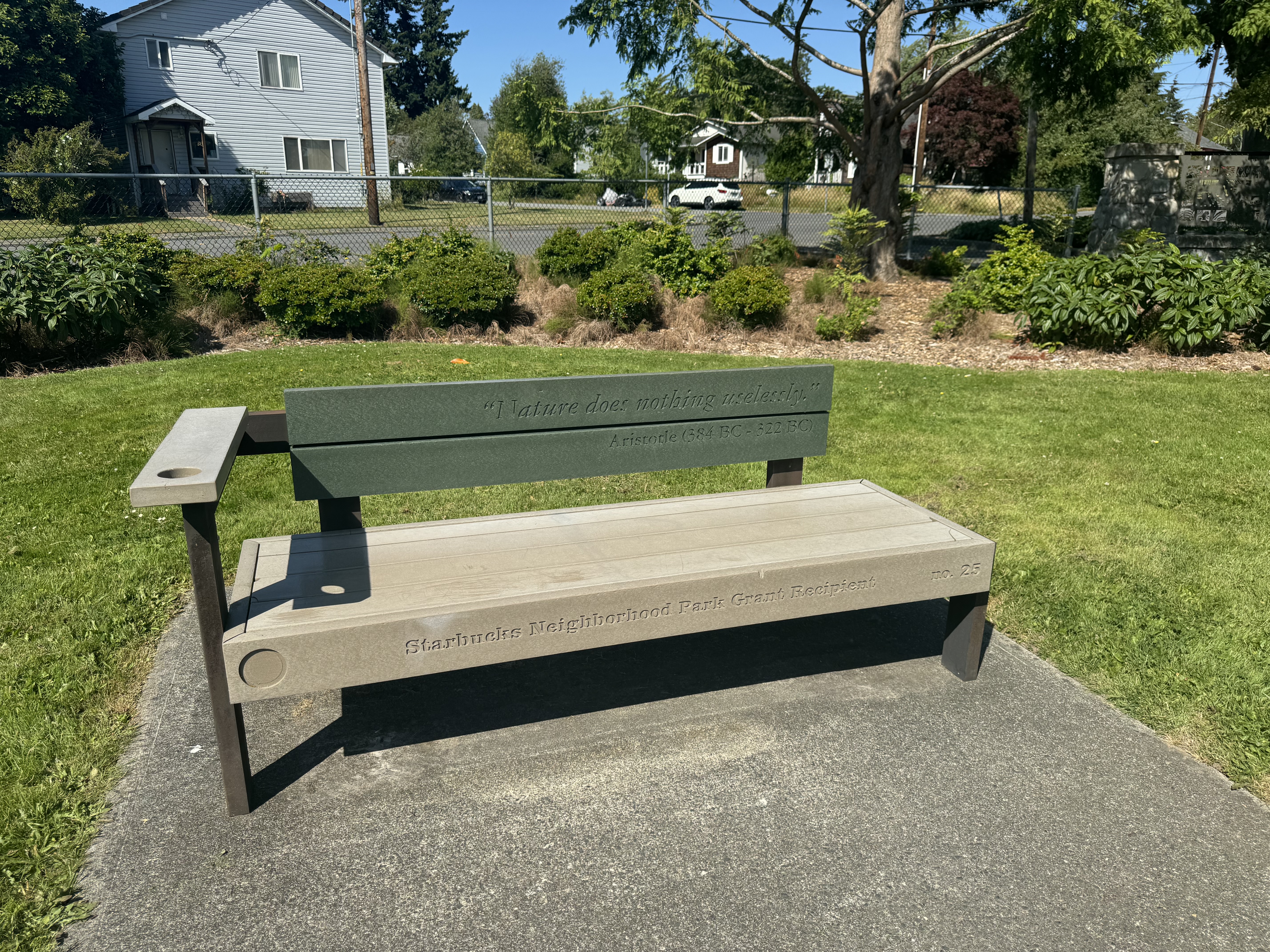 Large park in a city block, with modern facilities. Most importantly including a park bench paid for by Starbucks with an Aristotle quote on it. Thank you Starbucks.