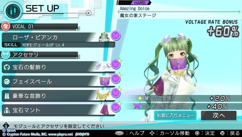 Also they’ve separated out the modules and songs into 5 groups: cute, cool, neutral, chaos & beauty. If you equip a module and accessories of the matching element you can gain boosts of up to 60% on your score. If you don’t have the maximum 60% boost you’re SOL on some of the harder challenges. Which is making the game more about RNG and equips than actual skill.
